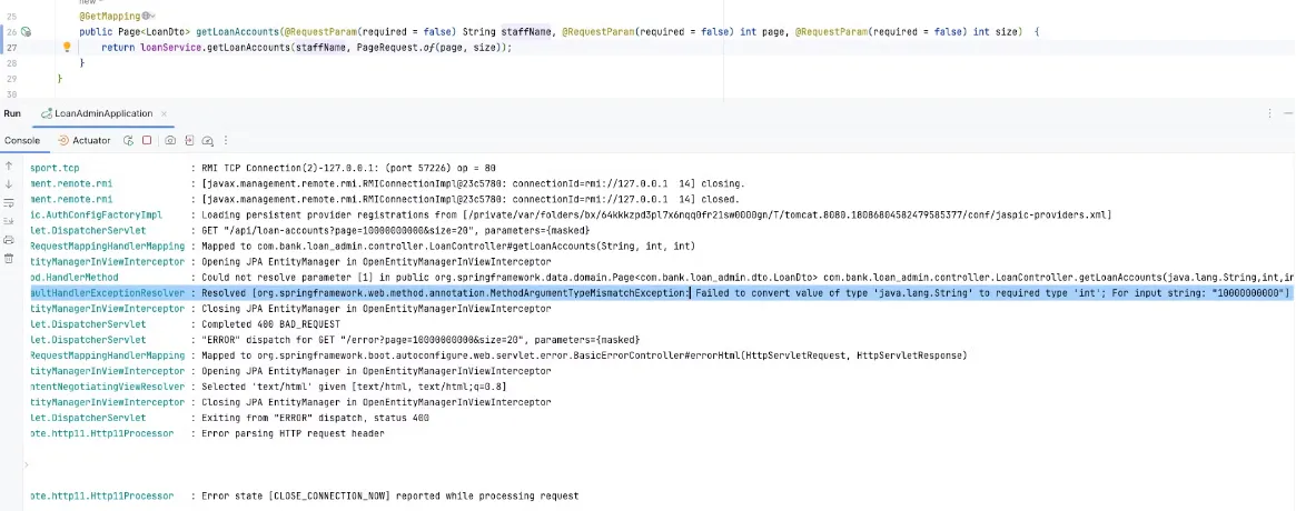 So I reproduced it again below, and as expected, the image shows that HandlerExceptionResolver threw an error saying it failed to convert the value to int.