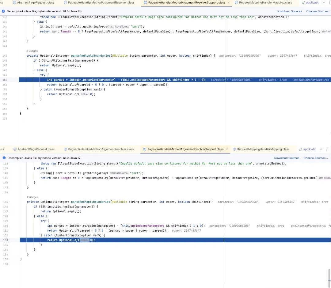 Analysis of why Spring Boot Pageable converts page values exceeding int range to 0 and its internal behavior.
